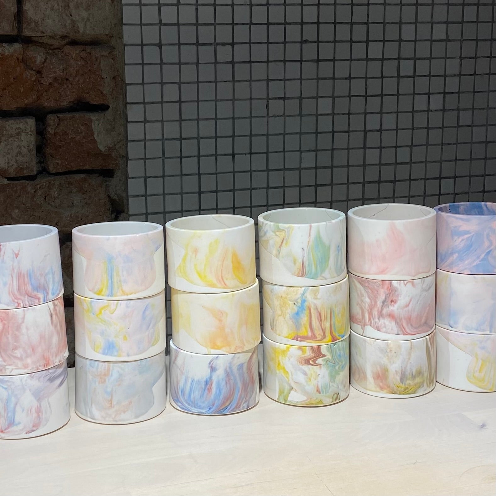 Kalíšky/podtácky jsou ručně zhotoveny z ekologické pryskyřice. Tento materiál s vlastnostmi betonu je velmi odolný a nehořlavý. Díky ruční práci se mohou objevit malé nedokonalosti jako vzduchové bublinky, které však nemají vliv na celkovou kvalitu a jsou běžným jevem takového materiálu.