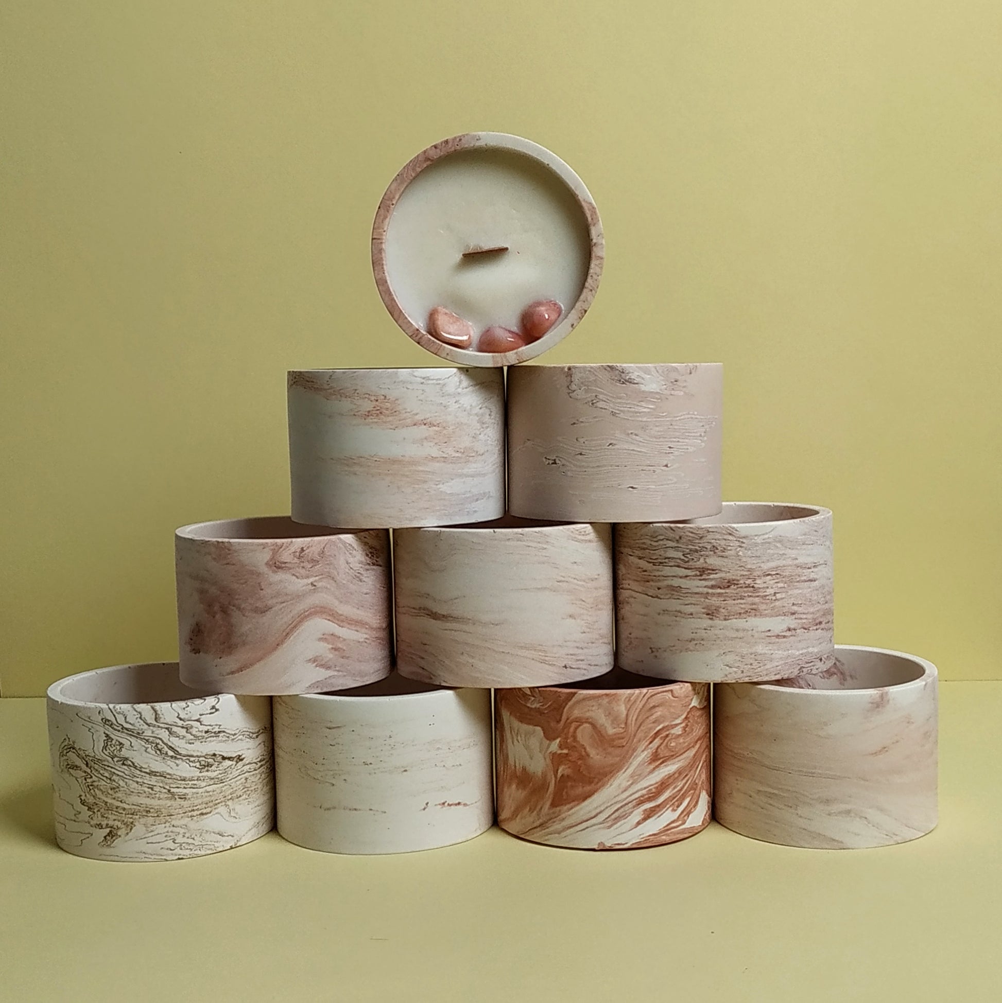 Kalíšky/podtácky jsou ručně zhotoveny z ekologické pryskyřice. Tento materiál s vlastnostmi betonu je velmi odolný a nehořlavý. Díky ruční práci se mohou objevit malé nedokonalosti jako vzduchové bublinky, které však nemají vliv na celkovou kvalitu a jsou běžným jevem takového materiálu.